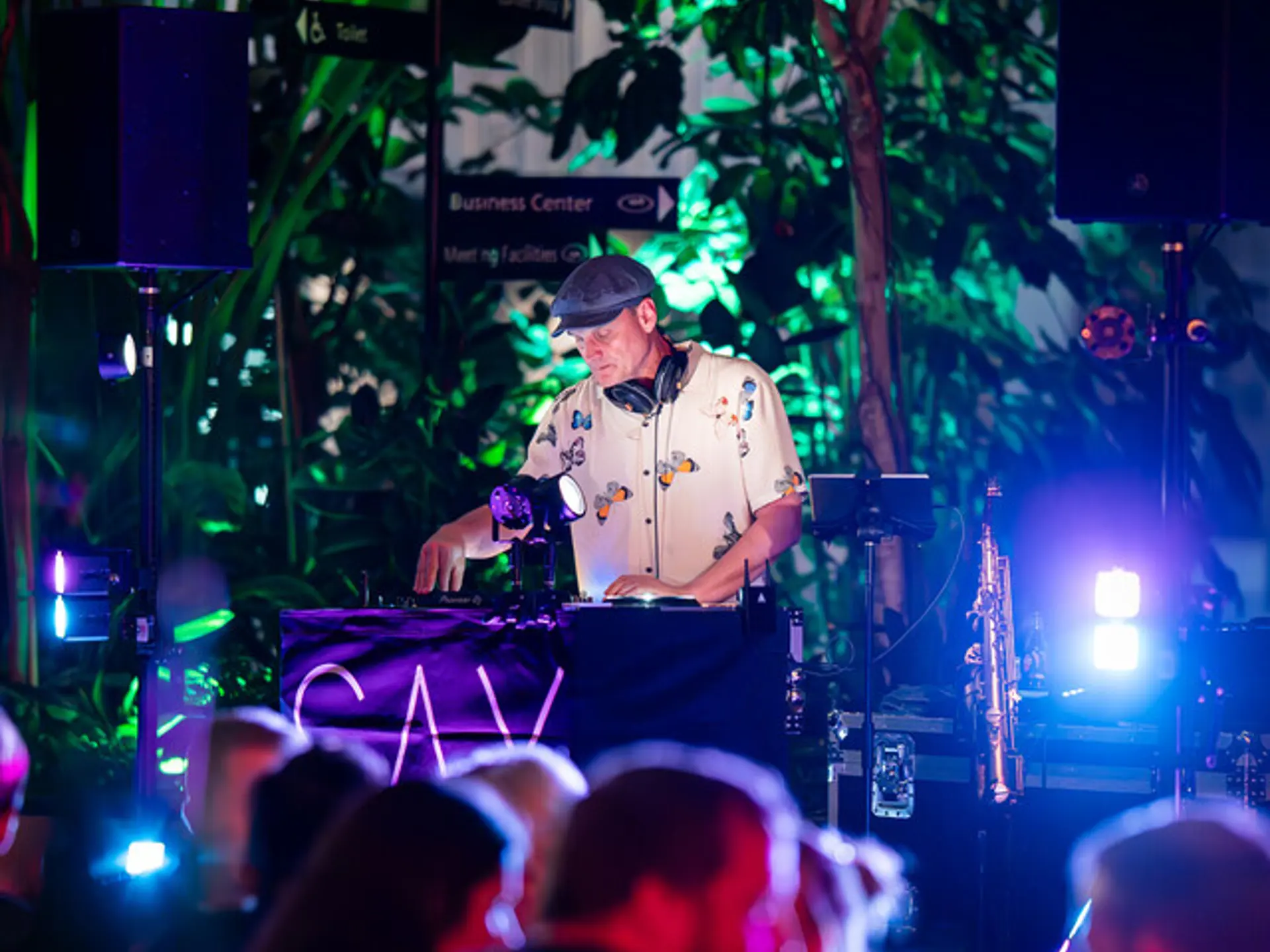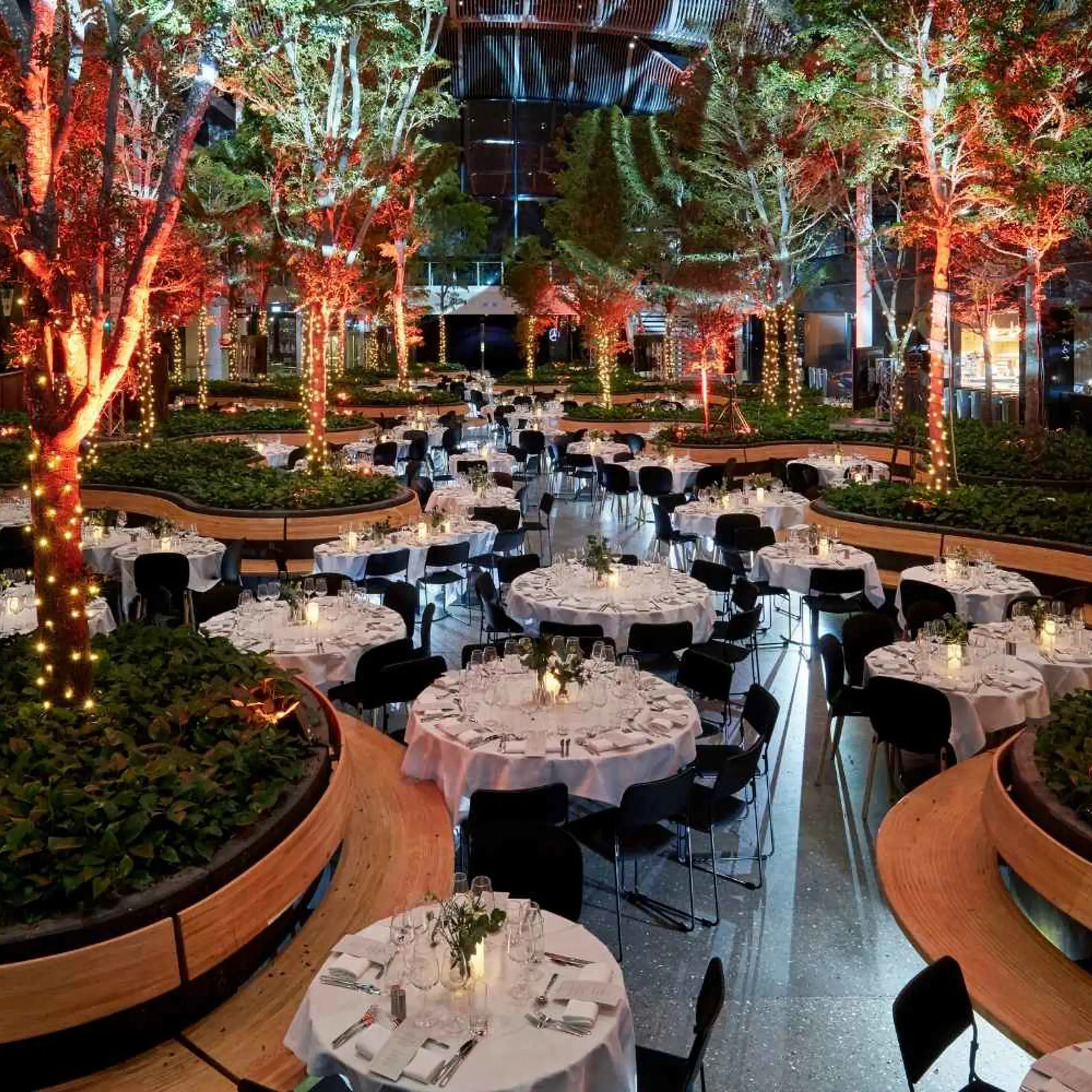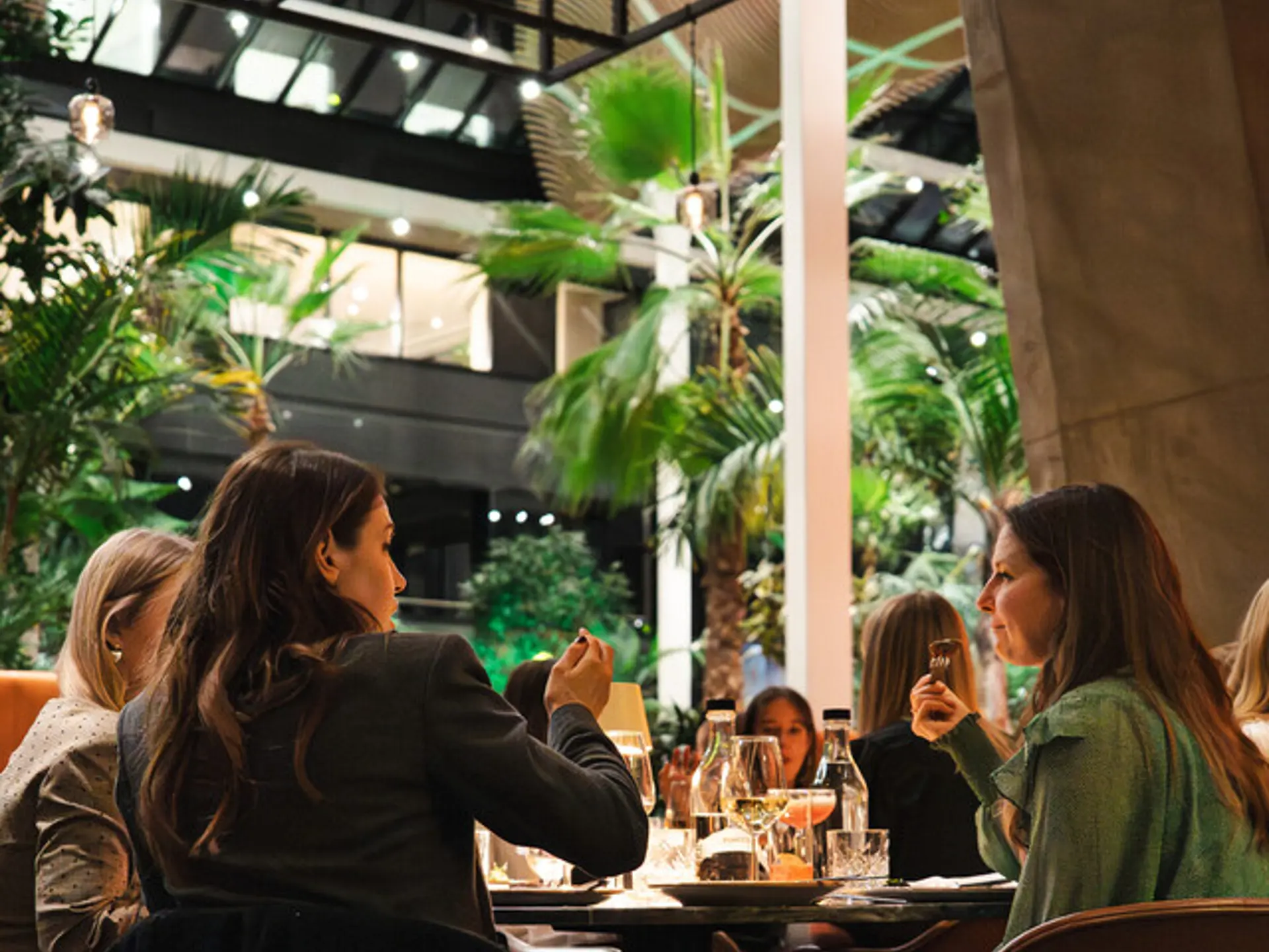 Vores 1.400 m² store atrium under glasloft giver sommerstemning – uden risiko for regn. Her får I dagslys, grønne omgivelser og mulighed for bar, DJ og dansegulv i samme rum.